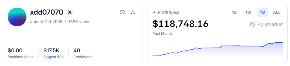 The user xdd07070 placed 40 predictions over the last month, gradually accumulating $118,748.16 in profit.
